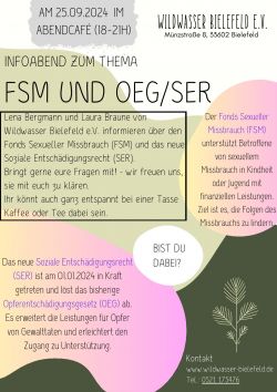 Am 25.09.2024 um 18 Uhr informierten Lena Bergmann und Laura Braune von Wildwasser Bielefeld e.V. im Rahmen des Wildwasser-Abendcafés über den Fonds Sexueller Missbrauch (FSM) und das neue Soziale Entschädigungsrecht (SER). Bei einer Tasse Kaffee oder Tee konnten mitgebrachte Fragen geklärt werden.